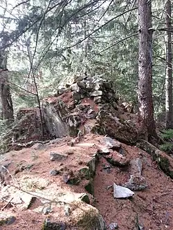 Eine nach Osten verlaufende Mauer schließt an den östlichen Gebäudeteil an und biegt nach etwa 2,25 Meter in nordöstliche Richtung ab. In diese Richtung verläuft die Mauer noch rund 2,4 Meter, ehe sie endet. Das Fehlen von weiteren Mauerresten und Schuttkegeln lässt auf eine Wehrmauer und nicht auf die Reste eines angebauten Gebäudes schließen.[33]