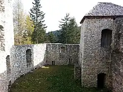 Östlich an den Bergfried ist ein nur mehr in Grundzügen erhaltener Baukomplex mit unregelmäßigem, grob langrechteckigem Grundriss sowie einem im Südosten angebauten Turm angestellt. Das genaue Aussehen und die Funktion dieses Komplexes lassen sich anhand der vorhandenen Funde und Mauern nur erahnen, und man kann, ausgehend von den original erhalten gebliebenen Fensteröffnungen in der Mauer, auf die angebauten Gebäude schließen. Die seit den 1980er-Jahren erfolgten Wiederaufbauarbeiten erschweren zudem die Deutung dieses Gebäudes. Anton Mell sah in dem Komplex einen Bering, der ein Wohngebäude oder den Palas umgab. Strittig ist auch die Frage, ob der ganze Bereich mit einem einzigen Gebäude verbaut war, oder ob es einen Burghof gab.[44][45]