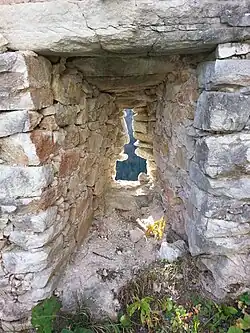 Der moderne und wahrscheinlich auch ursprüngliche Zugang zur Burg erfolgt über ein 2,7 Meter breites Rundbogenportal in der südlichen Mauer, direkt östlich des Bergfriedes. An den Seitenwänden dieses Portals befinden sich jeweils zwei übereinander liegende, zwischen 0,6 und 0,9 Meter tiefe Löcher mit einer Seitenlänge von rund 20 Zentimetern. Sie könnten ursprünglich Platz für die Schiebebalken oder die Halterungen eines Burgtores geboten haben. An der westlichen Innenseite dieses Portals befindet sich eine weitere, grob quadratisch geformte Öffnung mit einer Seitenlänge von etwa 25 Zentimetern, welche rund 2,1 Meter tief ist und dabei in das Mauerwerk des Bergfriedes hineinreicht. Östlich des Portals befinden sich drei Schießscharten, welche zumindest in jüngerer Zeit tiefer liegen als der Zugang zur Burg. Möglich ist, dass der Baukomplex ursprünglich ein unterschiedliches Bodenniveau hatte oder aber dass eine Treppe oder Rampe zum Portal hochführte. Das Gelände an der Außenseite des Portals fiel ursprünglich steil und felsig ab und wurde im 20. Jahrhundert eingeebnet, um den Zugang zu erleichtern. Einige Burgenforscher vermuten deshalb, dass während der ursprünglichen Nutzungszeit eine Holzbrücke zum Portal führte. Das Fehlen der ursprünglichen Ostmauer, welche erst im 20. Jahrhundert wiederaufgebaut wurde, lässt auch einen Zugang an dieser Seite vermuten. Anton Mell erwähnte in seiner Beschreibung der Burg aus dem Jahr 1925 noch einen nicht erhalten gebliebenen, 35 Zentimeter breiten, verputzten Kanal. Dieser führte von der östlich des Portals gelegenen Schießscharte hinauf zur Mauer, mit einer Abzweigung aber auch zum Portal selbst, und Mell vermutete in ihm er eine Art Sprachrohr für die Burgbesatzung.[49] Die drei Fenster in der Mauer über dem Eingangsportal sind vermutlich nicht original, auch wenn die Mauer hier ansonsten recht gut im ursprünglichen Bauzustand erhalten geblieben ist.[50]