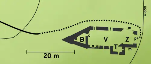 Legende: B = Bergfried, c = Hocheinstieg des Bergfriedes, V = Wohngebäude (Palas), Z = von Mell vermuteter Zwinger, wahrscheinlich aber der Burghof oder Teil des Palas, T = Flankierungsturm, m = Rundmauer (Bering), f = Fensteröffnungen, p = von Mell vermuteter Burgzugang, wahrscheinlich aber durchgehende Mauer, o = Rundbogenportal (ursprünglicher und moderner Zugang)