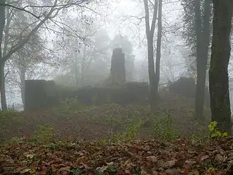 ![]() Die Burg Kranzberg an einem nebeligen Novembermorgen | ||