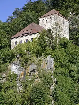 Es wird vermutet, dass sich an der Stelle der Burg früher ein römischer Wachposten befand, auf dessen Grundmauern der Turm aufgebaut ist. Funde von römischen Münzen aus der Zeit zwischen 284 und 306 nach Christus (Diokletian und Maximilianus) von 1845 scheinen dies zu bestätigen.[2] Das im 14. Jahrhundert erbaute Gebäude besteht aus einem Wohnturm mit angebautem Palas. Der Turm hat eine Grundfläche von 9,5 × 11 Meter, der Anbau misst 15 × 15 Meter. Der Palas wurde später als der Turm erbaut, was durch den im ersten Stock des Palas in den Turm führenden Eingang erkennbar ist. An der rechten Seite des Palas befindet sich ein (heute modernisierter) Abtritterker. Oberhalb des Einganges befindet sich eine kleine Burgkapelle. An der Unterseite des Turmes sind Kragsteine zu erkennen, d. h. der Turm konnte im Kriegsfall durch einen hölzernen Wehrgang verteidigungsfähig gemacht werden. Auch das Dach war früher entfernbar. Die ursprünglich vorhandenen Schutzmauern sind nicht mehr vorhanden, zogen sich aber vom Turm bis zur aufragenden Felswand. Der Platz vor dem Turm ist aufgeschüttet, darunter scheinen sich Stallgewölbungen zu befinden, wie durch die Lichtschlitze in der Wand erkennbar ist.
