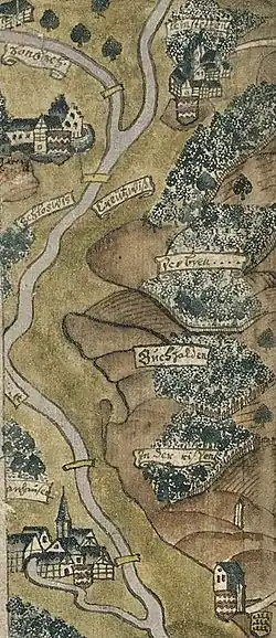![]() Landesarchiv Ba-Wü StAS KI Karten und Pläne / 1573 – ca. 2000 / Ritterschaftliche freie Pürsch in Schwaben am Neckar und Schwarzwald 1705 Leinstetten mit Schloss und Burg Leinstetten | ||
