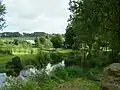 Auf der Westseite (Feldseite) der Burg befindet sich die großflächige Burgaue. Diese wird teilweise vom Oosbach begrenzt und von einem davon abgezweigten Mühlgraben durchzogen. Dessen Wasser diente zunächst der Befüllung der Burggräben, später auch dem Antrieb der Burgmühle und des Elektrizitätswerkes. Daneben wurde das der Burg zugeführte Wasser zum Tränken von Vieh, für die Fischzucht sowie als Löschmittel für den Fall eines Brandes genutzt. Der Mühlgraben ist erhalten, aber wegen des verfallenen Entnahmewerks am Oosbach ohne geregelten Wasserzulauf und verkrautet. Im Jahre 2004 war die Burgaue die nördlichste Außenstelle der Landesgartenschau Trier.[17] Heute (Stand 2013) ist die ehemalige Kulturlandschaft mit ihren Biotopen, Skulpturenpfaden, Ruhepunkten und dem Beobachtungsstand weitgehend verwildert, verfallen und nicht begehbar.