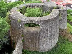 An der Schnittstelle zwischen Süd- und Nordzwinger im Westen der äußeren Ringmauer befindet sich der etwa 1500 eingefügte runde, oben offene Batterieturm. Er diente zur Aufnahme eines schweren Artilleriegeschützes und stellt die letzte bauliche Anpassung der Burg an die fortschreitende Kriegstechnik der damaligen Zeit dar.[12] Zu den Befestigungsanlagen des Vorwerks werden auch die in die äußere Ringmauer eingelassenen Schalentürme gezählt. Sie weisen bereits Schießscharten für Feuerwaffen auf und schützten die flacher abfallende Nordflanke der Burg und ihren Eingangsbereich.