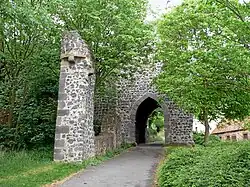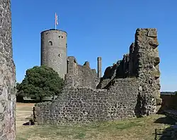 Der um 1260 errichtete westliche Bergfried hat einen Hocheingang in etwa zehn Metern Höhe, ist aber nicht öffentlich zugänglich. Der zylindrische, sich nach oben leicht verjüngende Turm wurde, wie der Ostturm, später erhöht und ebenfalls mit einem Spitzdach versehen, wahrscheinlich aber erst um 1500.[14]