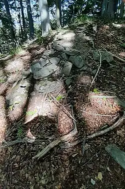 Burgplateau mit Turmstelle und verwittertem neuzeitlichen Grenzstein