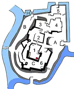 Die Burg liegt auf einem Hügel, der auf der Südhälfte ursprünglich von zwei Flüssen geschützt wurde. Betritt man die Burg vom Norden her durch das Tsunagomon (綱御門) genannte Tor, gelang man in einen ersten geschützten Vorbereich (5 in der Abbildung). Von dort erreicht man den dritten Burgbereich (三の丸, San-no-maru; 3), der vom Nordbereich (北の丸, Kita-no-maru; 4) flankiert wird. Durch weitere Tore kommt man zum zweiten Burgbereich (二の丸, Ni-no-maru, auch Mittlerer Burgbereich (中の丸, Naka-no-maru) genannt; 2) und von diesem schließlich zum innersten Burgbereich, dem Hommaru (本丸, Hommaru; 1). Die Bereiche liegen also auf einer Linie, bilden eine Verbundanlage, japanisch renkaku-shiki (連郭式) genannt. Das Hommaru erhebt sich über dem Awaji-no-maru (淡路の丸, 6). Zwischen Hommaru und Naka-no-maru ist ein tiefer trockener Graben angelegt, der mit einer „Brücke über dem Durchgang“ (廊下橋, rōkabashi) überquert wird.