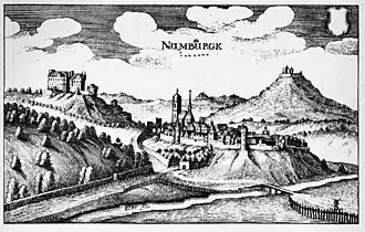![]() Links im Bild die noch nicht zur Ruine verbrannte Naumburg in einem Merian-Stich von 1646, der aber auf einer Vorlage von Wilhelm Dilich von 1605 beruht. | ||