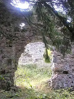 ![]() Burghof und Tor der Burg Nesselburg, rechts der Ansatz der Palaswand | ||