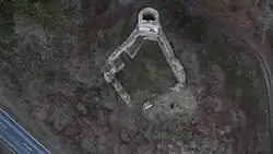 Der markanteste Bestandteil der Ruine ist der noch immer der etwa 24 Meter hoch aufragende Bergfried an der südwestlichen Ecke der Anlage. Der Durchmesser beträgt etwa 5,5 Meter bei einer Mauerstärke von 1,5 Metern. Er besitzt den ungewöhnlichen Grundriss eines angenäherten Halbkreises, wobei die dem Inneren der Burganlage zugewandte Seite eine Gerade bildet. Die sich anschließende südliche Mauer besitzt eine Stärke von 3 Metern und ist damit die mächtigste der Burg.[5][3][4]
