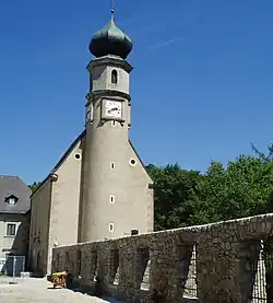 Zur Anlage der Burg gehört die einschiffige, mit einem Kreuzrippengewölbe versehene Kirche, die dem Heiligen Johannes Nepomuk geweiht ist. Sie ist eine eigenständige Pfarrkirche.
