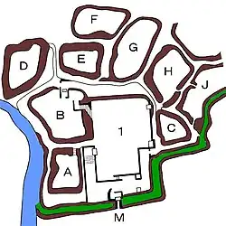 Die Burg weist die Merkmale einer mittelalterlichen Anlageform auf. Nur der innerste Bereich, das Hommaru (本丸) war durch Mauern geschützt, die Bereiche davor durch Erdwälle. Das Hommaru war direkt von dem [A] Matsuo-maru (松尾丸), [B] Moto-hommaru (元本丸) und dem [C] Imashiro-maru (今城丸) umgeben. Davor lagen die Bereiche [D] Nishi-no-maru (西の丸), [E] Naka-nomaru (中の丸), [F] Kita-no-maru (北の丸), [G] Ideya-no-maru (出屋の丸), [H] Moto-maru (元丸) und [J] Hachiman-maru (八幡丸). Verschiedenen Burgbereiche, wie am Haupttor im Süden und den Naka-no-maru, wurden in der Edo-Zeit erneuert und mit Steinen verstärkt.
