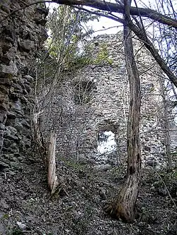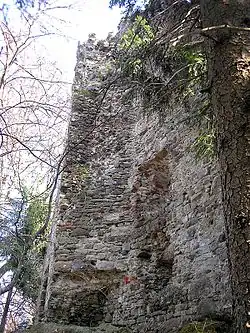Auf dem Burgplateau haben sich nur im Süden und Westen Reste der Burganlage erhalten. Die insgesamt etwa 18 Meter lange Südwand gegen die Angriffsseite ist fensterlos. In der Westwand (Länge ca. 9 Meter) sind einige Fensteröffnungen zu erkennen. Hier sicherte der senkrecht abfallende Burgfels die Veste. Die Mauerreste ragen noch bis zu 9 Meter hoch auf. Die westliche Gebäudekante ist abgerundet.