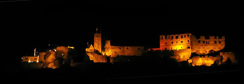 Durch einen Torturm, den um 1300 errichteten 21 m[8] hohen Uhrturm, gelangt der Besucher bei einem ersten – inneren – Burgrundgang heute zunächst im Norden der Anlage zur breiten Front des dreigeschossigen Palas, des sogenannten Darmstädter Baus, der in Fachwerk mit spitzen Giebeln ausgeführt war. Vom einst das Schloss 54 m hoch überragenden Bergfried ist nichts mehr zu erkennen. Er hatte einen Durchmesser von 10,5 m mit 3,5 m Wandstärke. Im 15. Jahrhundert war ihm ein schmalerer Rundturm aufgesetzt worden, der sogenannte Butterfassturmaufsatz. Auf dem Verbindungsweg zwischen Uhrturm und Palas, welcher der frühere Halsgraben der Burg ist, liegt der Große Keller, der 1587–89 in zwei deutlich sichtbaren Bauphasen überwölbt wurde. Der größte freitragende Gewölbekeller in Europa hat eine Länge von 24 m, eine Breite und Höhe von etwa 16 m und kann bis zu 400 Personen Platz bieten. Die Mauern sind bis zu 4 m stark. In den Keller war ein gemauertes Weinfass mit einem Fassungsvermögen von ca. 180.000 Litern eingebaut. Die Wände wurden mit Talg abgedichtet. Inwiefern sich dies auf den Geschmack auswirkte, ist nicht überliefert. Spätestens ab 1647 war der Tank nicht mehr gefüllt. Stattdessen wurden wieder normale Holzfässer eingesetzt.[9] 1997 wurde der Raum komplett renoviert und in seinen ursprünglichen Zustand versetzt. Seitdem dient er als Veranstaltungsplatz für Konzerte, Theateraufführungen und andere Darbietungen (Feuerwerk).