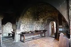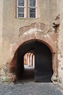 Von der Tordurchfahrt aus sind die anschließenden Räume erschlossen, darunter die südöstlich gelegene Wächterstube. Eine Wendeltreppe führte von dort in die ehemals vorhandenen Obergeschosse. Die Durchgänge besitzen korbbogige Portale, am Durchgang zur Wachstube ist die Jahreszahl „1542“ eingemeißelt. Ungewöhnlich für das 16. Jahrhundert sind die korbbogigen Fenstergewände.[35]