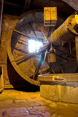 Am nördlich der Tordurchfahrt gelegenen Brunnenhaus wurden ebenfalls zahlreiche Umbauten durchgeführt. Zunächst als Wachstube für das Tor konzipiert, baute man 1529 nördlich des Tores einen dreieckigen Erker an. Die Jahreszahl befindet sich auch am Zugang zur Wachstube. 1550 wurde der dreieckige Vorbau nördlich des Tores für den Anschluss eines Wehrganges abgearbeitet. Ebenfalls in der Mitte des 16. Jahrhunderts, als der Fortschritt der Bergbautechnik die Anlage solcher Brunnen ermöglichte, wurde in das Wachhaus des Tores der Burgbrunnen nachträglich eingefügt.[32] Man betritt die Brunnenstube von der Tordurchfahrt aus. Die oberen Lagen des 96 Meter tiefen Brunnens bestehen aus Quadern, auf denen Zangenlöcher und Steinmetzzeichen erkennbar sind. Die Wasseroberfläche befindet sich in 84 m Tiefe, wobei der Brunnen ursprünglich eine Tiefe von 125 m hatte.[21] Hinter dem Brunnen befindet sich das hölzerne Drehrad aus dem 16. Jahrhundert, das von Menschen bedient wurde. Ein Teil des Mauerwerks und die gesamte Zwischendecke zum ehemaligen Obergeschoss der Wachstube mussten bei seinem Einbau entfernt werden.[31]
