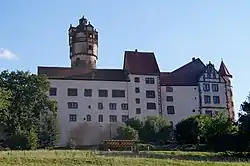 Für den südwestlich an den Marstall anschließenden Turmstumpf der hohen Umwehrung der Vorburg ist seit 1599 der Name „Hexenturm“ belegt, weil in diesem Jahr eine der Hexerei bezichtigte Frau dort eingesperrt wurde. Jahreszahlen auf einem spitzbogigen Portal im Untergeschoss und einer Schießscharte außen datieren die Bauzeit auf die Jahre 1550 bzw. 1549. Nur das Untergeschoss des außen halbrunden Turmes diente als Gefängnis. Oben trägt er eine Wehrplattform, auf der man recht gut die eigentliche Höhe der Vorburgmauer und die verschiedenen Typen von Schießscharten erkennen kann.[36]