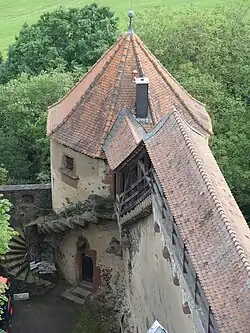 Der 32 Meter[21] hohe Bergfried hat einen runden Grundriss mit einem Durchmesser von etwas mehr als acht Metern. Sein bis zum Helm einheitliches Mauerwerk gehört wahrscheinlich der frühesten Bauphase an. Im dünneren Mauerwerk des geräumigen Saales im vierten Stock zeigen die Reste einer in die Mauer eingelassenen Treppe, dass dieser bereits zum Renaissancehelm gehört. Der ursprüngliche Eingang ist an der Hofseite im dritten Stock auf etwa zehn Metern Höhe als spitzbogige Pforte zu erkennen. Die beiden darunterliegenden Geschosse dienten als Verlies und waren nur von oben über ein Angstloch im Gewölbe zugänglich. Die heutigen Fenster wurden 1581 eingebaut. Man durchbrach die Wand zu deren Einbau, als man auch diese Geschosse zu Wohnzwecken nutzen wollte. Ein neuer seitlicher Zugang war bereits im 15. Jahrhundert durch einen angebauten Treppenturm mit Wendeltreppe entstanden. Die 57-stufige Wendeltreppe innerhalb des Bergfriedes beginnt deshalb erst im dritten Stock und setzt über einem dreiarmigen Bogen an, da man das ehemalige Loch zum Verlies anscheinend noch nicht zubauen wollte.[22]