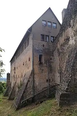 Der sogenannte Saalbau (auch Palas genannt) befindet sich an der Westseite der Kernburg und gehört im Kern zu den ursprünglichen Gebäuden der Burg. Das heutige Gebäude besitzt eine Grundfläche von 25 × 11,5 m und nimmt die volle Breite der westlichen Kernburg ein.[21] An seiner Südseite schließt sich der Wehrgang zum oberen Torbau nahtlos an. Der mittig vor dem Gebäude über dem Kellerhals angesetzte Treppenturm ist eine Ergänzung des 15. Jahrhunderts. Die Überdachung des Kellerzugangs mit Fachwerkstube stammt aus dem Jahr 1555. An der hofseitigen Fassade fällt links des Treppenturms im Obergeschoss ein polygonaler Erker aus Sandsteinquadern mit Kreuzstockfenstern auf. Er entstand im letzten Drittel des 14. Jahrhunderts, als man dort eine gotische Kapelle einrichtete, deren Apsis er bildete.[23] Neben einem Gewölbekeller, sowie größeren Wohn- und Hofstuben enthält das Gebäude eine Burgküche, die aber erst in der Renaissance dort eingerichtet wurde. Zuvor enthielt das Erdgeschoss einen größeren Saal, der zu einem kleineren Saal mit Küche umgebaut wurde. Im Mittelgeschoss sind Fachwerkwände des 15. Jahrhunderts erhalten. Das Obergeschoss musste nach dem Brandschaden von 1621 in größerem Umfang erneuert werden, weshalb nur an den steinernen Architekturteilen noch mittelalterliche Substanz vorhanden ist.[24]