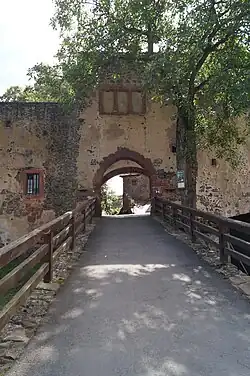 Das äußerste Tor der Kernburg besteht aus einem spitzbogigen Tor mit einem kleinen, eingeschossigen Torhaus und wird heute als Museumskasse genutzt. Über dem Tor befindet sich ein Wappenstein des Grafen Philipp von Ysenburg-Büdingen und seiner Gemahlin Amalie von Rieneck mit der Jahreszahl 1527.[33]