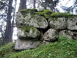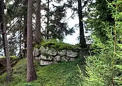 Im bergseitigen Graben liegen heruntergestürzte Trümmer einer starken Wehrmauer. Die unterschiedlichen Mauerstrukturen deuten auf mehrere Bauphasen und somit auf eine länger dauernde Benützungszeit hin.