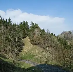Von der ehemaligen Burganlage ist nur noch ein tiefer Sattel vorhanden, der den ehemaligen Burggraben darstellt.