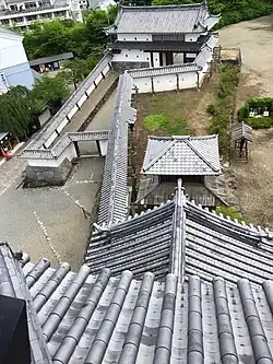Die innere Burg war von einem Steinwall umgeben und besaß an der Nordwest-Ecke einen dreistöckigen Wachturm (三階櫓, sangai yagura), der als Burgturm (天守閣, tenshukaku) fungierte. An der Südostecke befand sich der Tatsumi-Wachturm, an der Hitsujisaru-Wachturm.[a 1] Dort befand sich die Residenz (御殿, goten). Der Zugang zu diesem Bereich im Norden war durch eine doppelte Toranlage geschützt, bestehend aus dem Ōte-ichi-no-gomon (大手一ノ御門) und dem Ōte–ni-no-gomon (大手二ノ御門) geschützt, die einen kastenförmigen Schutzbereich zwischen sich hatten, eine ungewöhnliche Anlage.