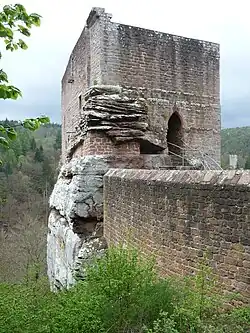 Von der Vorburg (Unterburg) aus zeigt die Ruine auf einem Sandsteinfelsen den befestigten Palas, das Burgtor der Kernburg (Oberburg) und die Schildmauer.
