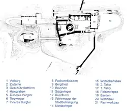 Die heutige Anlage ist eine Rekonstruktion des 20. Jahrhunderts, hauptsächlich basierend auf Grabungsfunden und einem Kupferstich Matthäus Merians aus dem Jahr 1646. Die Pläne für den Wiederaufbau stammten mehrheitlich von Ernst Stahl, der sich bei seinen Entwürfen eng an die Merian-Darstellung hielt und sich dort, wo dessen Stich nichts hergab, an anderen historischen Vorlagen orientierte. So zeigt die nahezu rechteckige, etwa 55 mal 24 Meter[48] messende Anlage den typisch regelmäßigen Grundriss einer Burg aus der Stauferzeit, die sehr klar gegliedert ist. Die Größen der heutigen Gebäude vermitteln in etwa den Eindruck der einstigen Anlage, deren ältester Baubestand die Fundamente des Bergfrieds, Teile des Palaskellers sowie einige Abschnitte der Ringmauer sind.