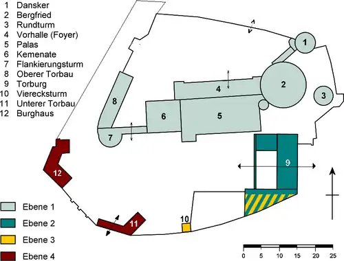 Im Osten der Anlage, in der Nähe zur ehemaligen Burgkapelle und heutigen Kirche St. Lucia, erhebt sich ein Geschützturm, der ab 1889 seine aktuelle Höhe erhielt. An ihn schließen sich fortschreitend nach Westen der Palas und der Gerichtsbau sowie der Westturm als Flankierungsturm und der obere Torbau an. Eine Ebene tiefer befindet sich südlich davon der untere Burghof, der sowohl über eine Treppe vom oberen Burghof als auch über eine Torburg im Osten des Burgareals zugänglich ist. Ein Teil des Torburg-Fundamentes steht auf der sich im Süden anschließenden, wiederum etwas tiefer gelegenen dritten Ebene, auf der ein Vierecksturm sowie ein Kräutergarten zu finden sind. Von dort ist über eine Treppe die vierte und damit tiefstgelegene Ebene des Burgareals erreichbar, auf der sich der untere Torbau sowie das Burghaus befinden.
