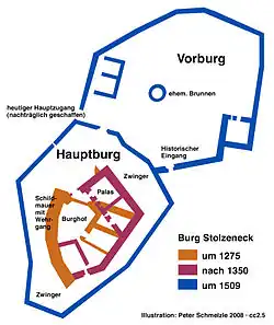 Zwinger und Vorburg mit Zisterne sind im 15. oder 16. Jahrhundert entstanden. Einige Fundamentreste in der Vorburg zeugen von einst dort befindlichen Wirtschaftsgebäuden.