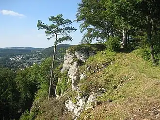![]() Vorderer Gipfel des Schlossfelsens, auf dem vermutlich der Burgturm stand | ||