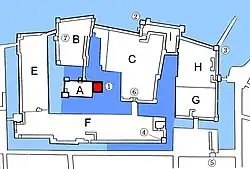 In der Mitte der am Meer gelegenen Burg befand sich der zentrale Burgbereich (本丸, Hommaru; A) mit dem Burgturm (天守, Tenshu; 1 = rot markiert). Nur von Norden her war dieser Bereich durch eine Brücke vom zweiten Burgbereich (Ni-no-maru; B) erreichbar. Im Westen befand sich durch einen Graben getrennt der dritte Burgbereich (三の丸, San-no-maru; C).