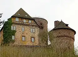 Durch einen aus dem Fels geschlagenen Halsgraben ist die Burg zu den Häusern der Ortschaft abgetrennt. Über einen Holzsteg mit Zugbrücke bestand eine Verbindung. So gelangte man durch ein niedriges Tor in den Burghof. Der mächtige, Rapunzelturm genannte Bergfried, der über 40 m hoch ist, bis zu 7 m dicke Wände und über 130 Stufen hat,[1] ist in die Westmauer integriert. Er besitzt einen Fluchteingang vom Burghof her und ein Verlies. Vier Pechnasen dienten der Verteidigung. Drei originale Schießscharten sind in der Westmauer erhalten. Die restaurierte und mit Zinnen versehene Mauer ist begehbar. Gegenüber liegt das Haupttor, früher über eine Zugbrücke erreichbar. Die heutige Einfahrt ist von zwei Ecktürmen flankiert. Eine Turmspitze ist zerstört. Der andere Turm ist mit einem Fachwerkaufsatz ausgebaut. Hier wohnte früher der Torwächter und das Stadtgefängnis befand sich im Turm. Zwei weitere Türme verstärken die Eckpunkte der Burgmauer. In einem ist ein Abtritt, die Burgtoilette, von außen zu sehen. Die Dächer des Hauptgebäudes, Festes Haus genannt, sowie der drei Ecktürme sind noch mit Sandsteinplatten gedeckt. Drei Stockwerke sind ausgebaut. Im Treppenturm, er ist noch sichtbar, war eine Wendeltreppe. Eine Erweiterung des als Amts- und Gerichtshaus dienenden Gebäudes fand nach dem Dreißigjährigen Krieg statt, indem Landgraf Karl auf der Schlosskapelle weitere Etagen aufstocken ließ. Dabei wurde die Eichentreppe eingebaut, die die alte Wendeltreppe ersetzte.
