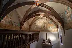 Es gibt auch eine Schlosskapelle aus dem 14. Jahrhundert mit dem Freskenzyklus von 1549, der die Passionsgeschichte zeigt. Die Schlusssteine der Rippenkreuzgewölbe zeigt die Wappen derer von Vellberg, Buttlar und Crailsheim. Zudem waren auch Stifter, Ritter und Edelfrauen des Vellberger Adelsgeschlechtes zu sehen. Der Rittersaal (Hakensaal) im 1. Obergeschoss zeigte Jagdszenen der Haller Patrizier als Wandmalereien.[3]