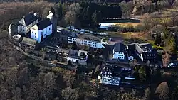 Die mit Ringmauer und Halsgraben geschützte Burganlage war nur von Osten her über eine Zugbrücke zugänglich. Im Zuge der Verfüllung des Halsgrabens verschwand auch die Zugbrücke. An sie erinnert noch heute ein Wegestück mit dem Namen Op dr Bröck (Auf der Brücke). Die ehemals vorhandenen beiden Toranlagen von Vorburg und Hauptburg sind heute auch verschwunden.