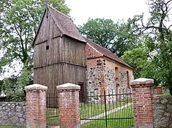 - Das ehemalige Gutshaus ist ein eingeschossiger Fachwerkbau mit Walmdach, das an der Tür auf 1740 datiert ist. Dahinter befinden sich Reste eines mittelalterlichen Wehrturms sowie auf einem Hügel die Reste eines kleinen, quadratischen Gebäudes, das von einem ringförmigen Wassergraben umgeben ist.[10]