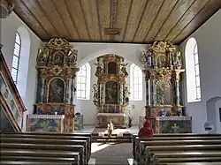 Die Altäre der Kirche stammen aus dem Hochbarock. Der Hochaltar zeigt den Erzengel Michael als Namenspatron der Kirche beim Höllensturz. Die Darstellung stammt aus der Zeit um 1680. Flankiert wird der Altar durch die Holzfiguren des Ignatius von Loyola und des Märtyrers Johannes Nepomuk. Im Auszug des Altars ist der heilige Wandel zu sehen.