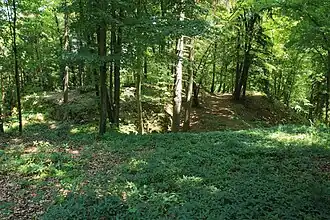 100 Meter vor der Spornspitze überquert den Sporn zusätzlich noch ein Wallgraben, er ist aber wohl nicht der mittelalterlichen Burganlage zuzurechnen, sondern einer Abschnittsbefestigung einer vorgeschichtlichen Höhensiedlung. Der leicht vorgewölbte Wall ist rund 100 Meter lang, 13 Meter breit und von innen noch zwei Meter hoch erhalten. Ihm ist ein stark verflachter Graben vorgelegt, er erreicht nur noch eine Tiefe von 0,3 Meter. Dieser Wallgraben verläuft von der südlichen Hangkante aus bis fünf Meter vor die nördliche Kante und biegt hier auf einer Länge von 12 Metern nach innen um, um so eine Torgasse zu bilden, den früheren Zugang zur vorgeschichtlichen Siedlung. Ein Durchbruch durch den Wall in seiner Südhälfte ist rezent entstanden.[5]