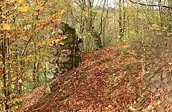 | Erhaltungszustand | Ruine, Burghügel, Mauerreste | |