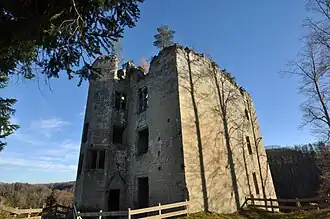 Von der ursprünglichen Burg des 12. Jahrhunderts sind nur geringe Reste nachweisbar. Bei Ausgrabungen fand man einen Pfeiler der Zeit um 1400 sowie Hinweise auf den einstigen Brunnen. Auch konnte eine Mauer gen Westen und Norden wiederentdeckt werden, an deren Innenseite Häuser standen. Das Herrenhaus, das vermutlich auf dem Fundament der Burg entstand, weist keine Verteidigungselemente auf. Es gilt als Vorbild für freiburgische Vogteien des 16. Jahrhunderts wie Romont, Rue und Surpierre.[18] Nachgewiesen wurde zudem ein Wehrgang.[13][19] Die Kaminreste gelten ebenso als Besonderheit wie die versetzten Aborterker.[20] In Resten erhalten ist zudem ein Turm im südlichen Eingangsbereich der Burg oberhalb des hinauf führenden Weges, dessen Mauerwerk teils noch mehrere Meter empor ragt. Es könnte sich dabei um den ehemaligen Hauptturm (Donjon) handeln. Erhaltene Pläne der Anlage zeigen den Grundriss in den Jahren 1735 bzw. 1897. Aus diesen geht hervor, dass sie sich in drei Burghöfe gliederte. Aufgrund der Grösse der Anlage getätigte Vermutungen, es könne auch hier eine Stadt gegeben habe, gelten als widerlegt.[21]