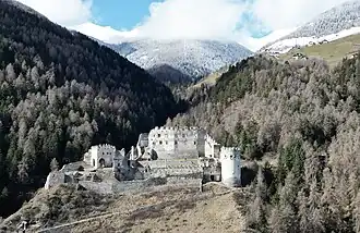 Erstmals 1259 wird die Burg als landesfürstlicher Besitz der Grafen von Tirol genannt, scheint aber bereits um 1200 von den Vögten von Matsch als adeliger Stützpunkt gegründet worden zu sein.[1] Um 1315 wurde die Anlage ausgebaut und die Burghut von den Tirolern den Herren von Lichtenberg anvertraut, die sie um 1400 mit berühmt gewordenen heldenepischen Fresken ausstatten ließen. Sie stellen neben dem Freskenzyklus auf Schloss Runkelstein den bedeutendsten Profanzyklus im Tiroler Raum dar, wurden zwischen 1908 und 1912 wegen Gefährdung abgenommen und in das Tiroler Landesmuseum nach Innsbruck gebracht. Einige wenige Fresken verblieben in der Kapelle der Ruine und wurden 2006 restauriert. Bei Grabungen seit 1994 wurden einige bedeutende Fragmente von abgefallenen Fresken wieder geborgen.[2] Aus dem Jahr 1431 liegt ein umfassendes Inventar der Burg vor.[3]