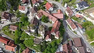 Von der ehemaligen Burganlage sind nur noch wenige Mauerreste auf einem Felsturm erhalten.