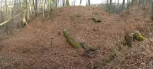 ![]() Burgstall Ödes Schloss – Ansicht der Kernburg und des Abschnittsgrabens vom Gelände der Vorburg | ||