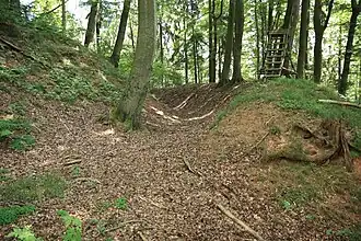 Zwischen der Vorburg und der etwa gleich großen Hauptburg befindet sich ein etwa 6 Meter tiefer und an seiner Oberseite noch 10 bis 12 Meter breiter Abschnittsgraben (Bild 5), der gerade von Nord nach Süd verläuft. Die Grabensohle ist an den beiden Enden heute noch bis 4 Meter breit,[10] die Mitte des Grabens ist durch einen Erdrutsch stark verengt. Am östlichen und vor allem am nördlichen Grabenende hat sich ein je ein großer Abraumhügel erhalten, der nördliche springt noch etwa 20 Meter bastionsartig aus dem hier steil abfallenden Hang hervor, und fällt dann ebenfalls sehr steil zum Tal hin ab (Bild 6).