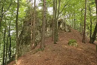Burgstall Ratzenberg – Westliche Ansicht des zentralen Felsturmes, auf dem das Hauptgebäude der Burg stand (2012) | ||