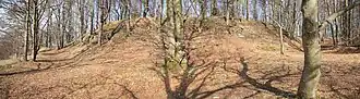 ![]() Burgstall Altes Haus – Ansicht der Oberburg von der westlich gelegenen Unterburg aus | ||