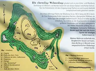 Die ehemalige Burganlage mit den Maßen 100 mal 55 Meter gliedert sich in eine Unter- und eine Oberburg. Die Unterburg zog sich sichelförmig von der Südseite über die Westseite bis zur Nordseite um die Oberburg. Im Norden war die Unterburg nur noch als Zwinger ausgeformt, im Süden und Westen war ihre Fläche größer, dort standen ehemals Gebäude, von denen aber nichts mehr zu erkennen ist.