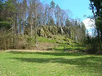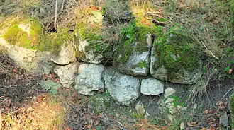 Das Plateau war von einer Ringmauer umgeben, von der noch ein letzter Mauerrest mit zwei Quaderlagen zu je vier Quadern in einer Felsspalte auf der Westseite zu sehen ist (Bild 3), außerdem sind Grundmauerreste auf der Ostseite vorhanden. Der nördliche Teil der Ringmauer ist als Hangkante noch zu erkennen. Vom südlichen Teil ist dagegen nichts mehr zu sehen.